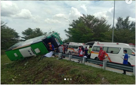 Bus tersebut terguling saat hendak keluar di KM 312-313 Jalur B dari tol arah Semarang menuju destinasi wisata Guci, Kabupaten Tegal.