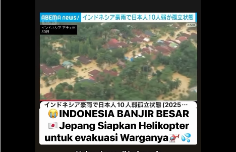 Pemerintah Jepang mempersiapkan helikopter untuk mengevakuasi warganya yang terjebak banjir bandang di Aceh, dengan laporan menyebutkan delapan warga Jepang dalam kondisi selamat sambil menunggu proses evakuasi tersebut.