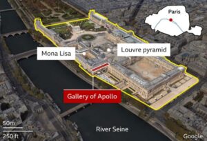Menurut laporan majalah Le Parisien, para pencuri masuk melalui fasad yang menghadap Sungai Seine—yang kebetulan sedang ada pekerjaan konstruksi—dan menggunakan lift barang untuk naik ke galeri.