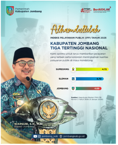 Di bawah kepemimpinan Bupati Jombang Warsubi dan Wakil Bupati Salmanudin, Pemkab Jombang berhasil menembus tiga besar nasional capaian Indeks Pelayanan Publik (IPP) Tahun 2025, sekaligus menjadi pemerintah kabupaten dengan nilai IPP tertinggi di Jawa Timur.