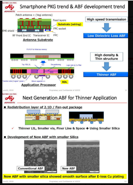 Ajinomtoto dari perusahaan bumbu penyedap masalah mengembang menjadi penghasil ABF (Ajinomoto Build-up Film) material sebagai lapisan dielektrik insulasi utama dalam proses build-up pada substrat semikonduktor multilayer. Goto: ajinomoto
