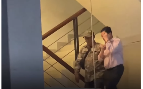 Rudy kemudian mencoba menutupi wajahnya saat naik tangga ruang pemeriksaan. Di lantai 2, ia menurunkan badannya hingga bertiarap.