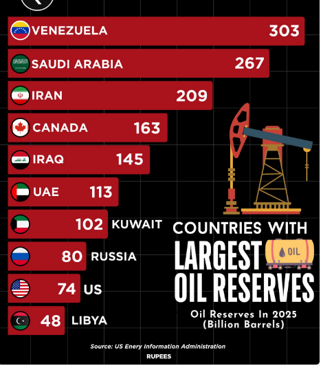 Venezuela sendiri memiliki cadangan minyak terbukti sekitar 303 miliar barel, terbesar di dunia menurut US Energy Information Administration (EIA). Dengan harga minyak terkini di kisaran 57–61 dolar AS per barel, nilai teoritis maksimum cadangan itu berada di sekitar 17–18 triliun dolar AS.